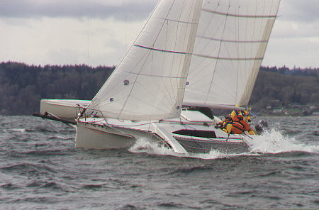 | Trillium heading for the Pully Point mark Where is the leeward ama? |