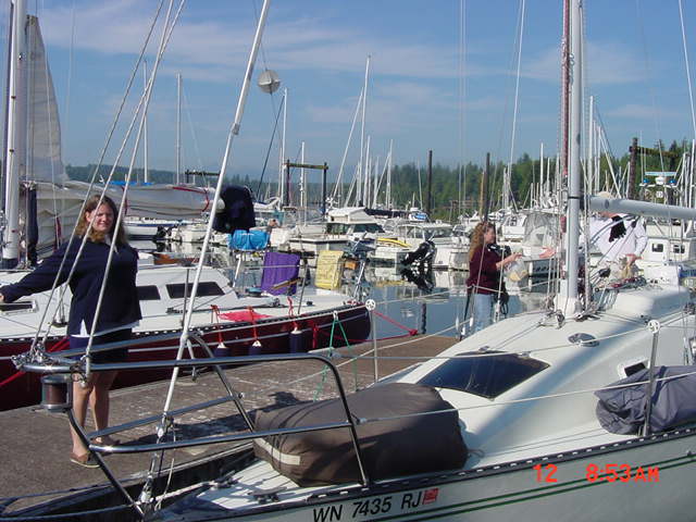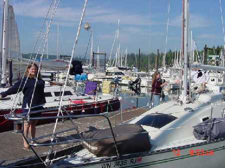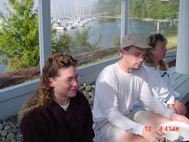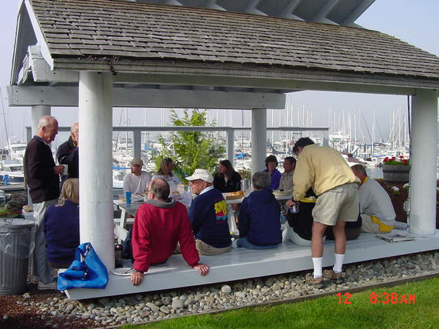 Saturday we sailed (or motored) to Port Ludlow. Sunday morning was becoming sunny, but fog was over the water. This is the view of the marina from the picnic area |
