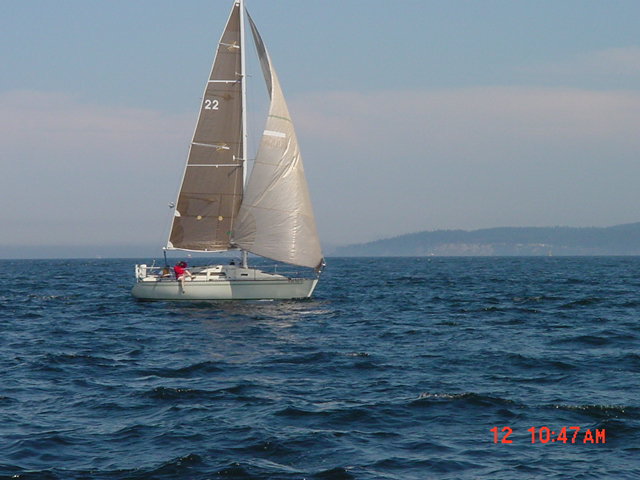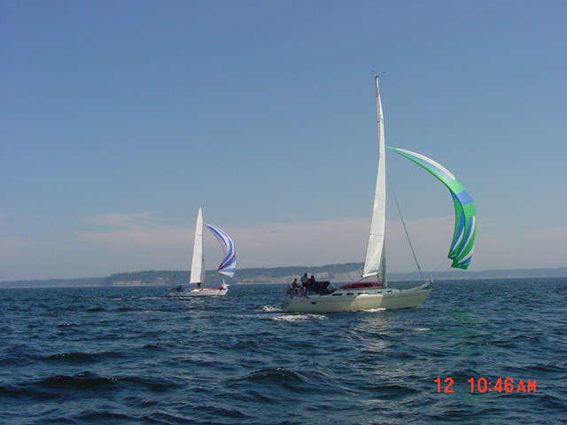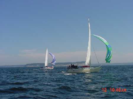 By the time we got to Foul Weather bluff, the fog had burned off and we started the Gibson race. Here are Outlaw and Nonsense