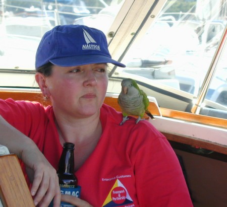 Saturday we sailed to Longbranch. Capt. Tabby is good at keeping a compass course, but the trimers have to be careful, as she can't handle much weather helm |