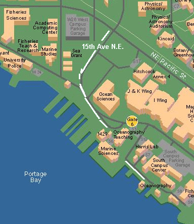 The model is in the Old Oceanography building, along the lake. Drive from the intersection of 15th Ave NE and NE Pacific St south on 15th NE. (Pacific St stretches from the football stadium along the UW medical center.) Park in the Jensen boat yard lot, near the building labeled "1429" on the map. (If you park on the UW campus in the garage, they will want you to pay.) Walk toward the building labeled "Oceanography" on the pier. Someone will meet you and let you in.